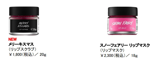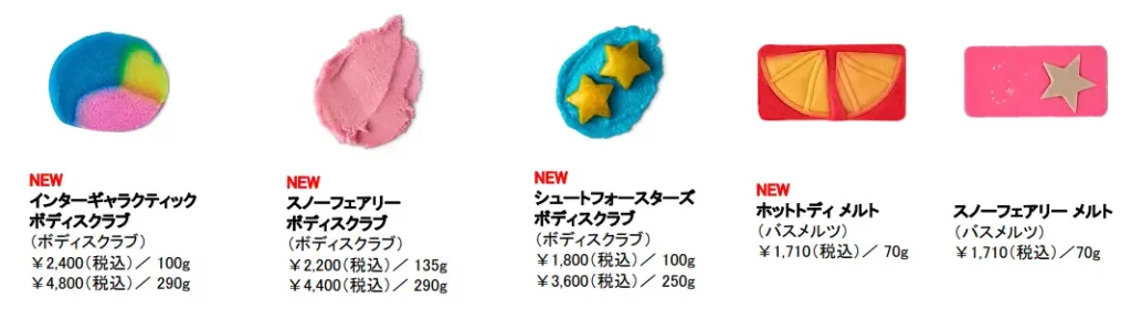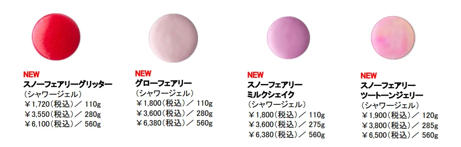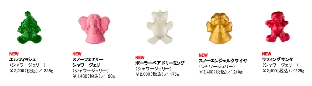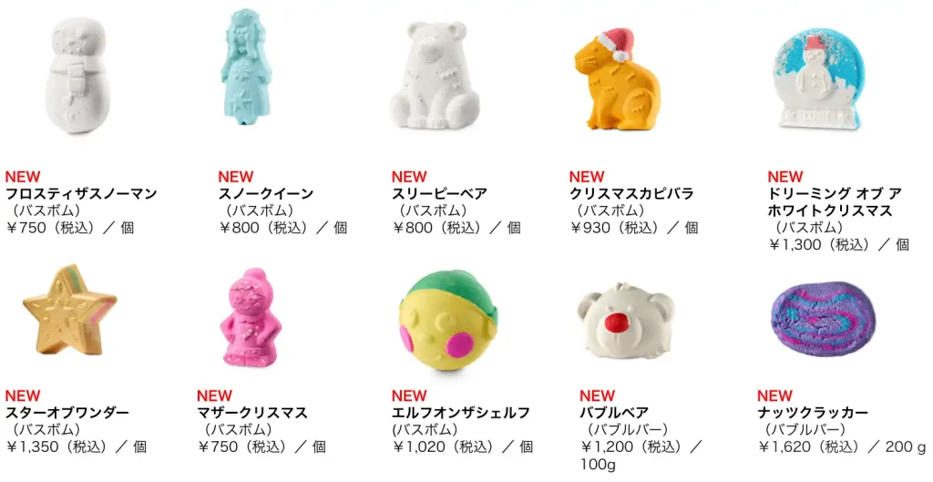 内容レインディア ボム、スリーピービーバー、バターベア、スイートプディング、スパイシートム、マジカルサンタ、シュートフォースターズ、スノーマン ドリーミング、キャッチミーイフユーキャン、スノードリフト、スノーフェアリー ボム、ペンギン ボム、スターオブワンダー、サイレントナイト ボム、マイリトルユニコーン、ファザークリスマス、キャンディケーン、スノーフェアリーロール、ナッツクラッカー、スパークリーグリーンツリー、ゴールデンディライト、クリスマスイブ、メリークリスマスエブリワン、スノーフェアリー シャワージェル、ヨッグノッグ シャワージェル、スリーピーベア シャワージェル、ベイクド アラスカ M、ユールログ ソープ、シュートフォースターズ ボディスクラブ、スノーフェアリー ボディローション、アフターディナーミンティ
